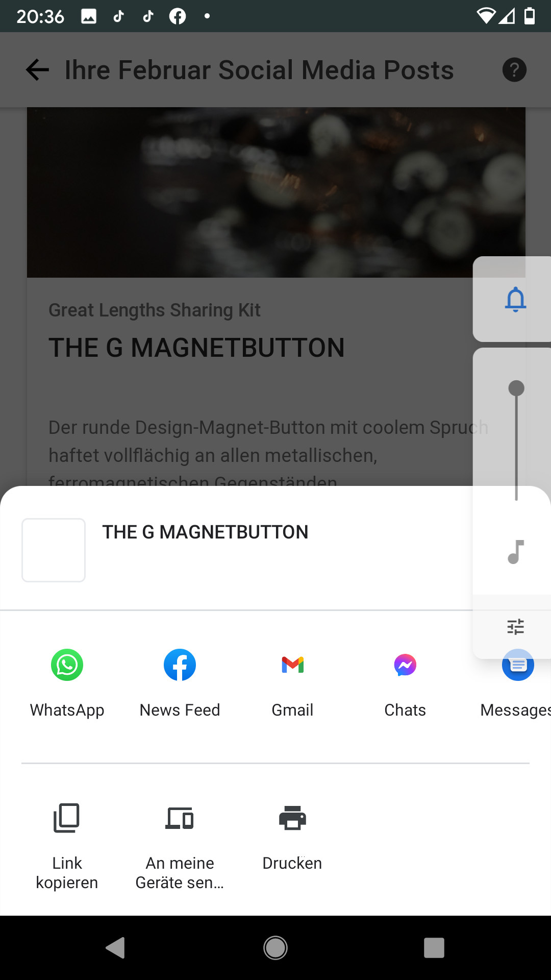 TEILEN: Der Text kopiert sich automatisch in die Zwischenablage. Wählen Sie das gewünschte Medium (Instagram, Facebook, Whatsapp, Mail, …) und wie gewohnt posten.