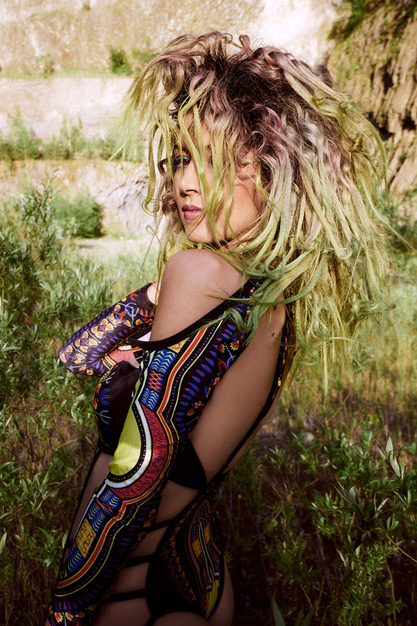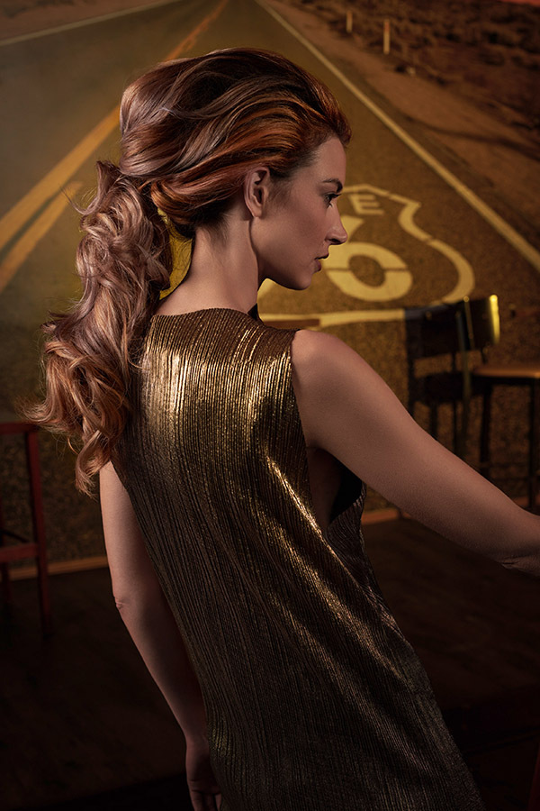 Crazy Colors? Ganz im Gegenteil! Alle Farben in Look 5 kommen 1:1 in der umgebenden Landschaft vor. Und wie die Landschaft verändern sie je nach Licht und Schatten ihren Charakter. Marietta fühlt sich in dieser Harmonie von Natur und Haar sichtlich wohl. Wichtig für den natürlichen Touch des Looks ist der dunkle Haaransatz, der den Farblook und die Bondings erdet. Der grüne Verlauf von Hell auf Dunkel unterstreicht das zusätzlich. Zur Haarstruktur: Der Ansatz wurde mit dem Lockenstab gewellt, in der Länge wurde das Haar abwechselnd geknotet und gekreppt.