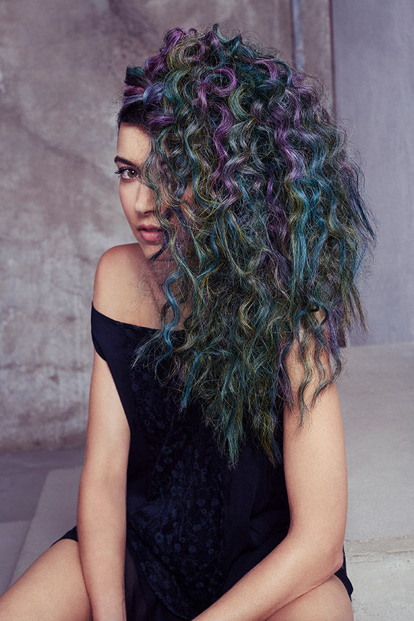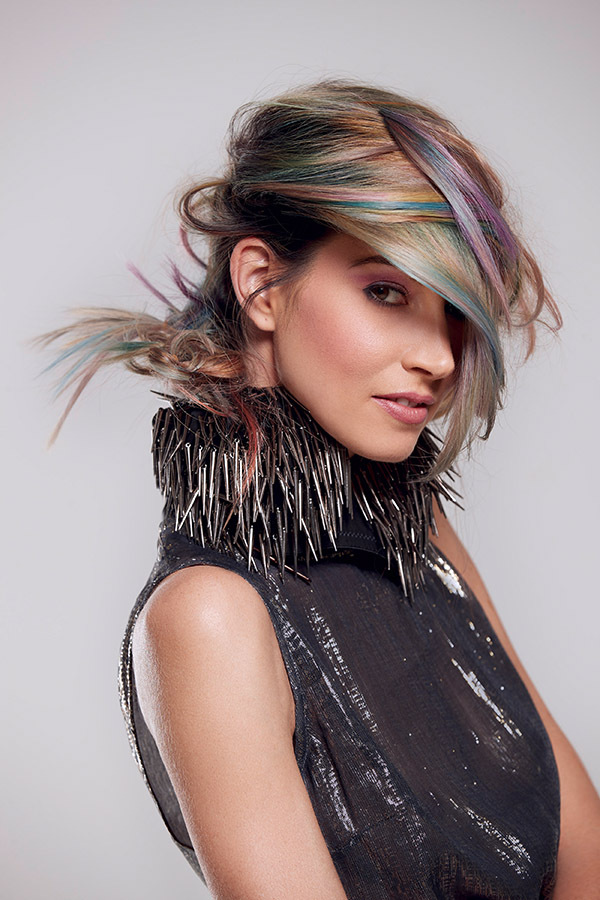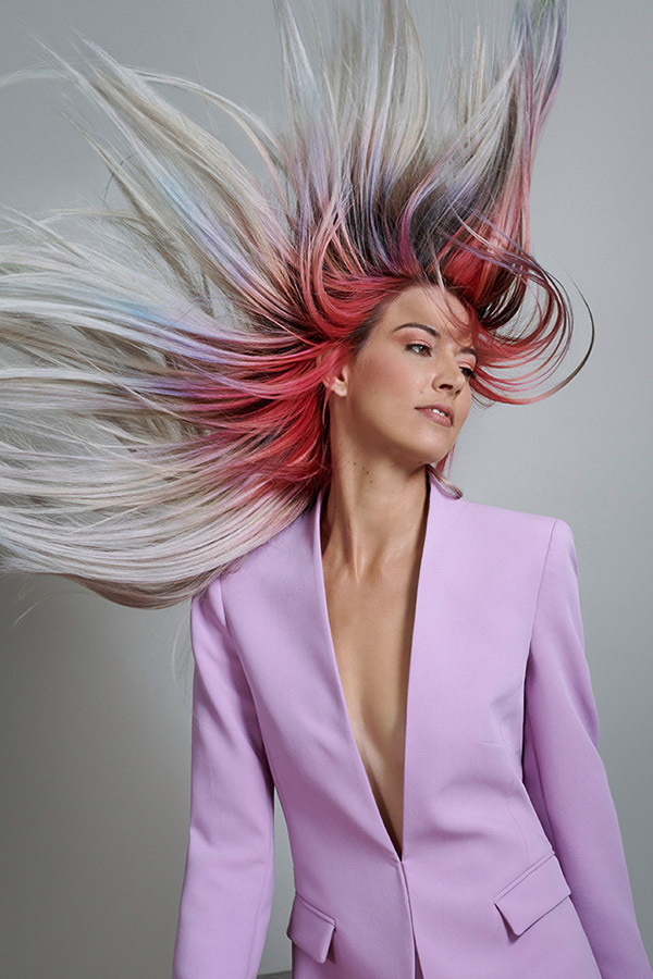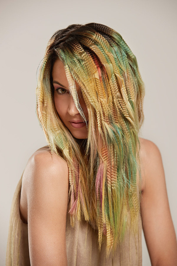 Wenn 12 Nuancen aufeinandertreffen, dann ist mit einem ziemlich starken Farbsound zu rechnen. Wie laut es dann wird, zeigt Look 2. Kontraste sind hier absolut erwünscht. Und es ist auch erwünscht, dass mit jeder Bewegung neue Spektren sichtbar werden. Dass die Haare dank GL PRE-BONDED Extensions die Farbe bis in die Spitzen stark und kontrastreich zeigen, steigert diesen Effekt noch zusätzlich. Hier wurden kühlblonde Strähnen verwendet, um mit dem Eigenhaar identisch zu sein und eine gleichmäßige Ausgangsbasis zu schaffen. Die aufgetragenen Farben reagieren dadurch gleichmäßiger und intensiver auf das Gesamthaar.