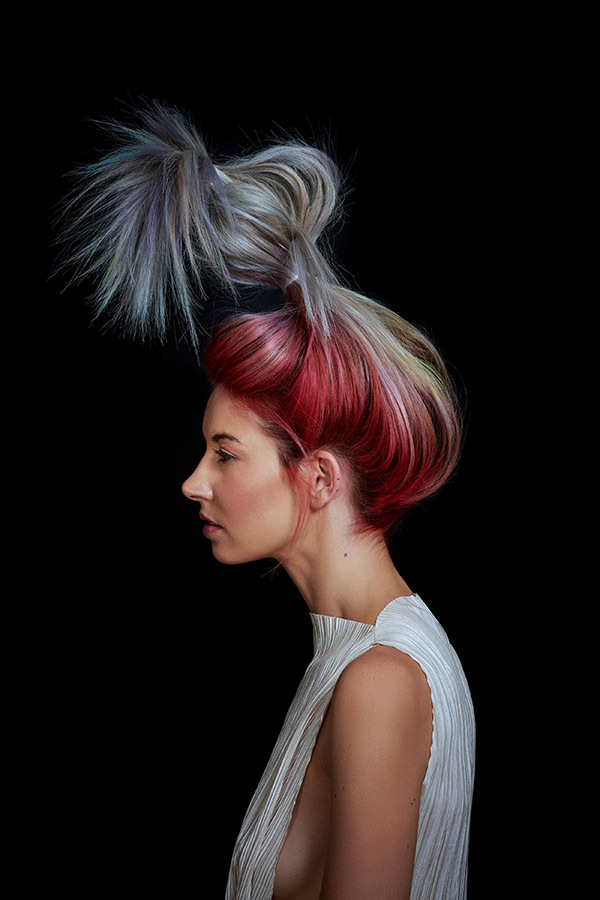 Eine Färbung – zwei extrem unterschiedliche Resultate. Der sechste Look lebt von der Spannung, die das vorerst verdeckte Rot permanent erzeugt. Er lebt aber auch von der unglaublichen Tiefe des silbrig-weißen Haares, die durch gelbe, grüne, graue und blaue Farbnuancen erzeugt wird.
